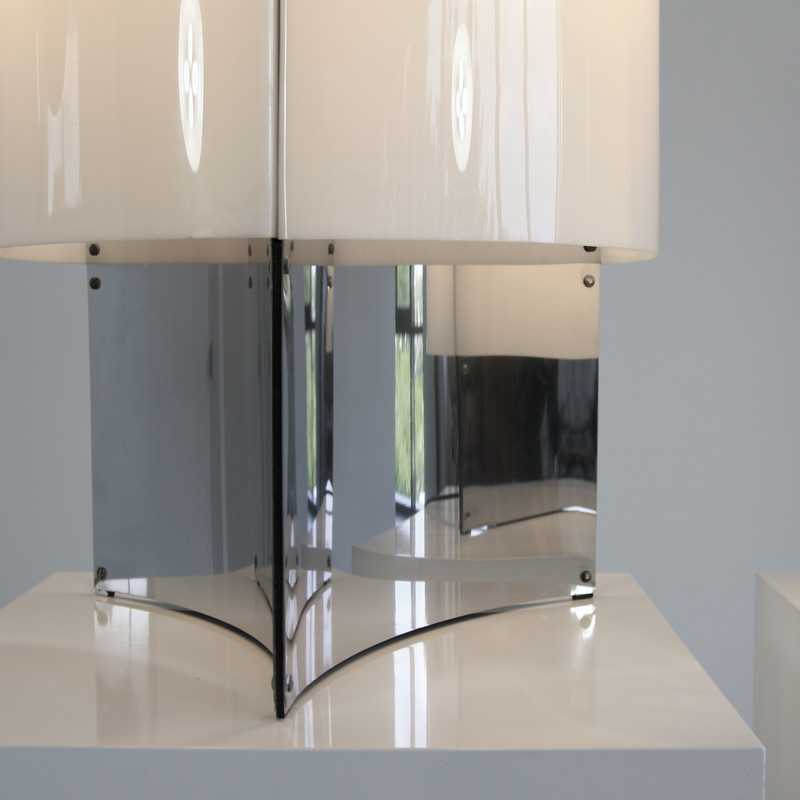 Chromed metal base with opaque perspex diffuser, divided into three sections. 3 light sockets. Original label attached.