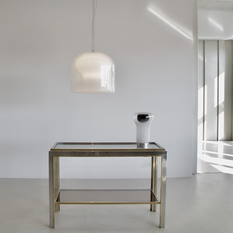 Rare 'NARANZA' suspension lamp with two white opaque hand-blown Murano glass bells, creating beautiful diffused light. One E27 socket, height adjustable metal suspension. AMAZING!