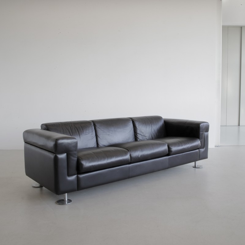 Large sofa upholstered in the original black leatherette designed by Tecno's Borsani and Bonetti in 1966. Polished metal feet appear retracted inwards with respect to the centre of the disk. Original Tecno label on foot. Beautiful condition!