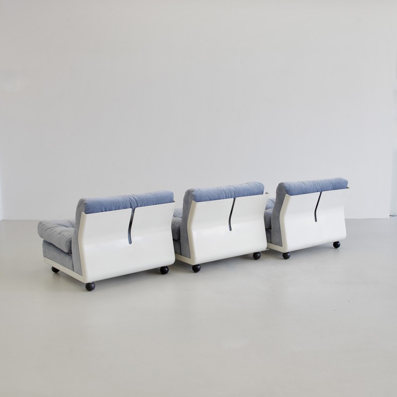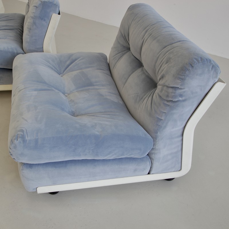 The AMANTA sofa range by Bellini, using Fiberlite (fibreglass-reinforced polyester). The flexibility was made possible by the strategically placed vertical slit in the backrest. The modular units are connected with a plastic element to form a sofa. Newly upholstered in light blue velvet. Super comfortable!