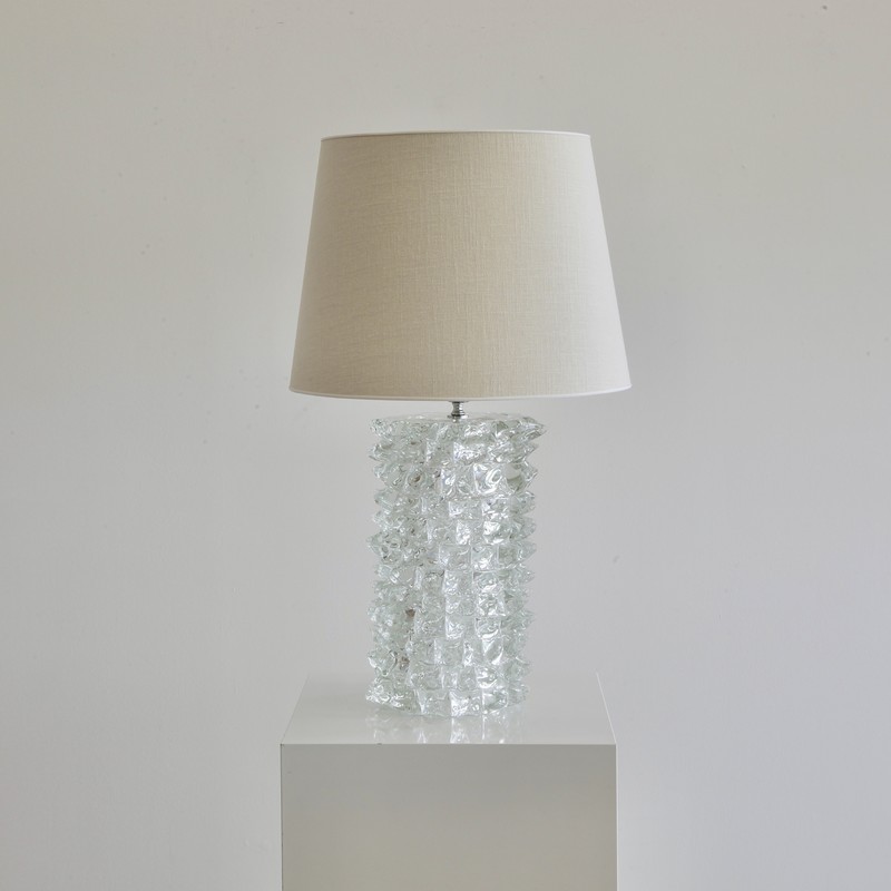 A large table lamp with spiky hand-blown glass base with one E27 light fitting and white linen cord. On top sits a linen lampshade. Beautiful.