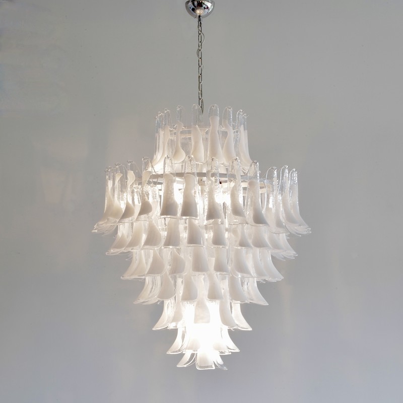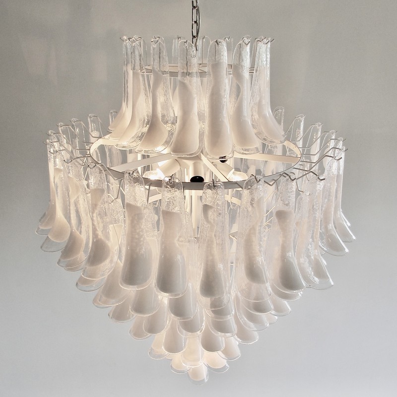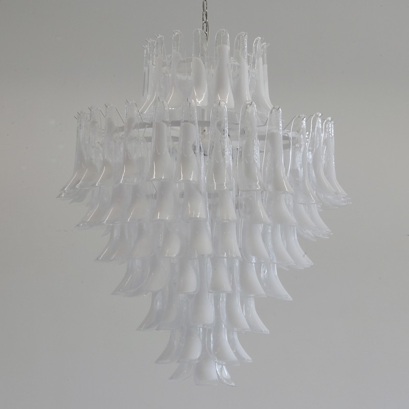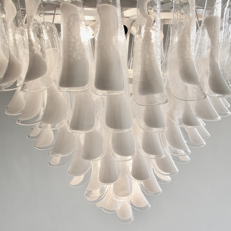 A very large chandelier with a white painted steel frame and well over 100 hand-blown 'Saddle Form' glass pieces. Clear glass, each with individual white colouration. With thirteen E27 light sockets. Chromed metal chain and ceiling cap. Please note, the measurements are always without the chain.