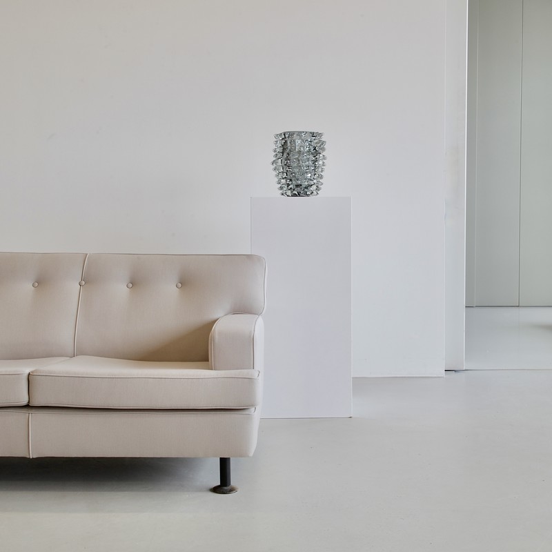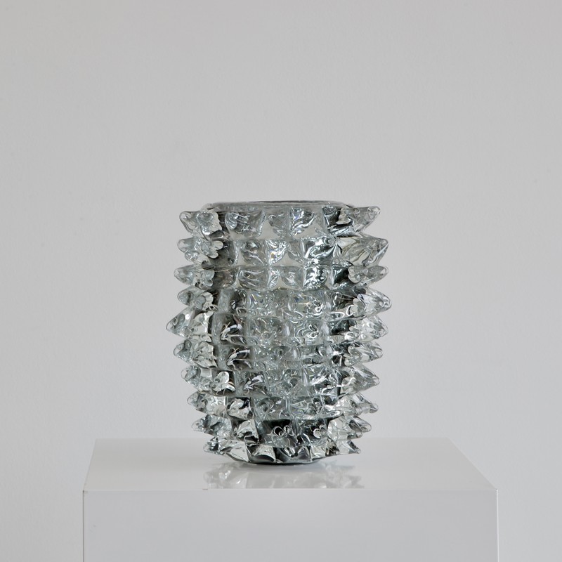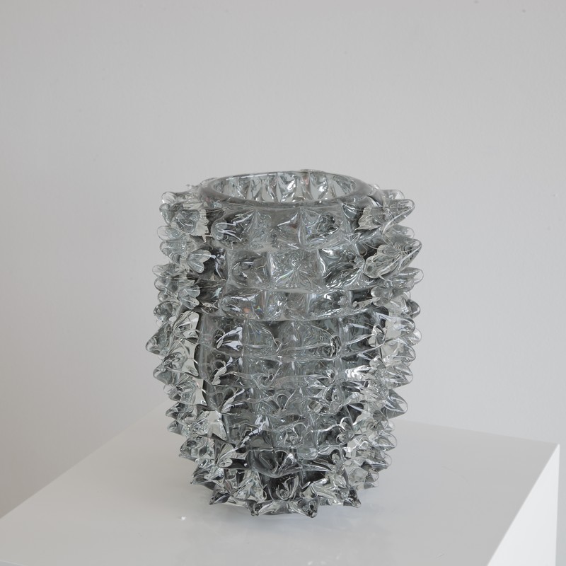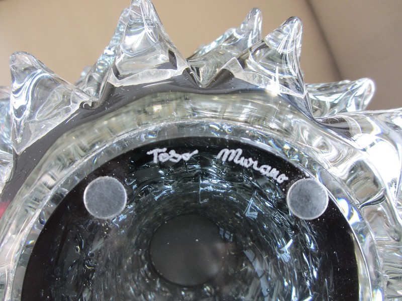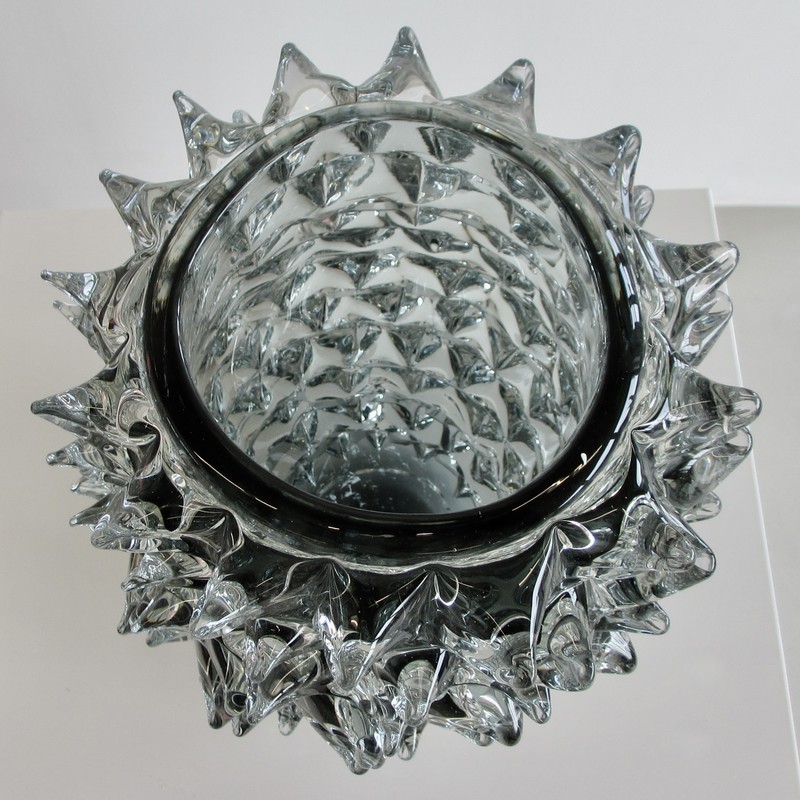 Gray/blue glass vase with spikes, engraved with signature on base. Heavy and decorative piece, made in Murano.