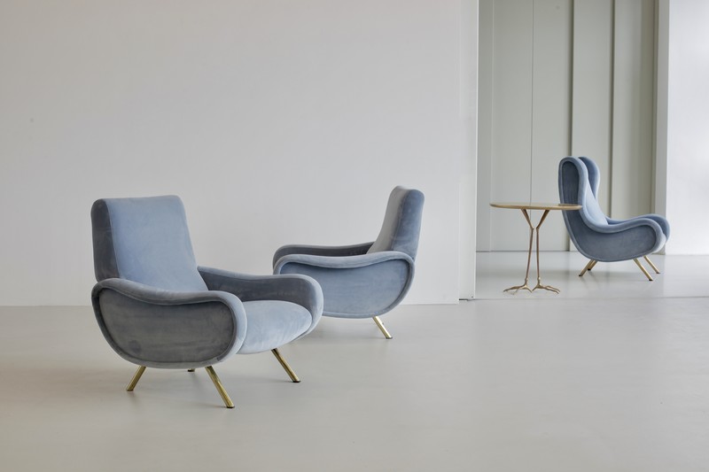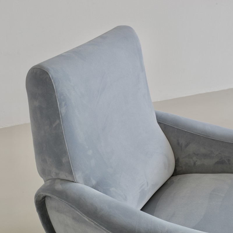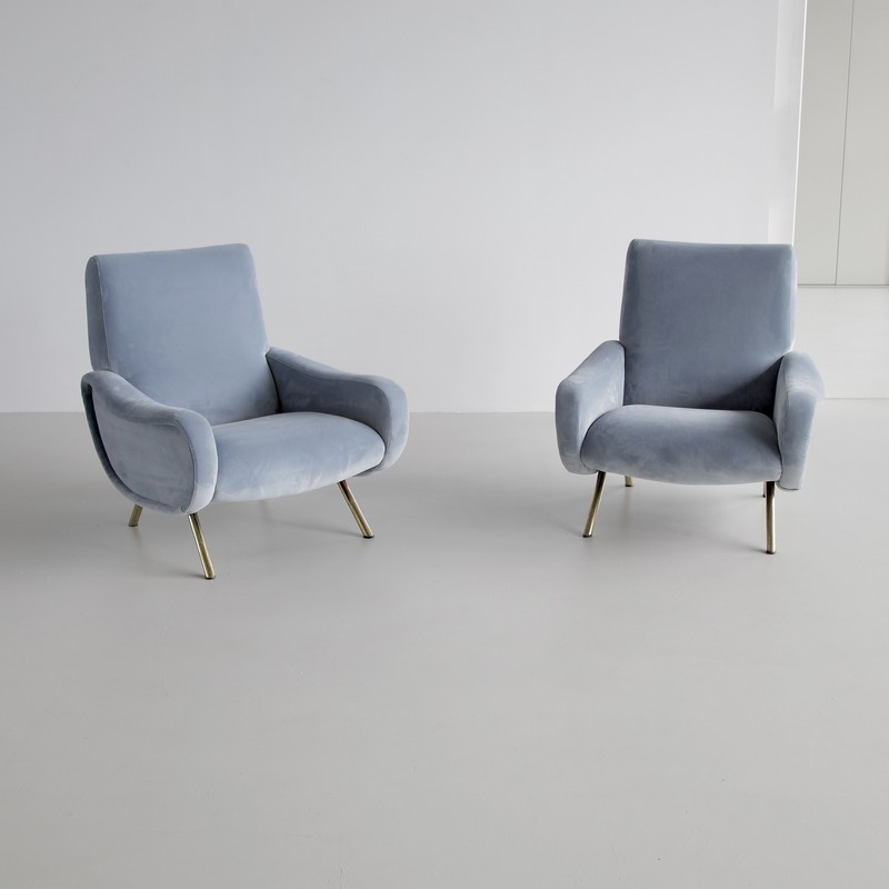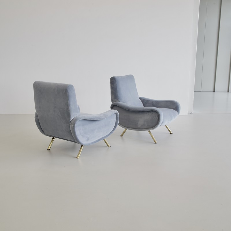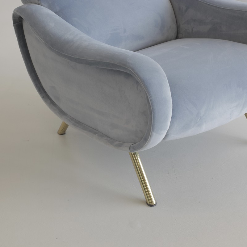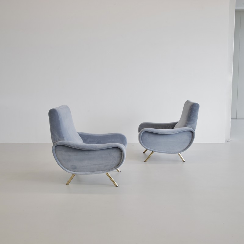 A pair of original 'LADY' lounge chairs designed by Marco Zanuso for Arflex, Milano. The chairs have been upholstered in blue velvet. Brass coloured legs. Seat height 36 cm. This chair design was awarded the Gold Medal at the IX Milan Triennale, in 1951.