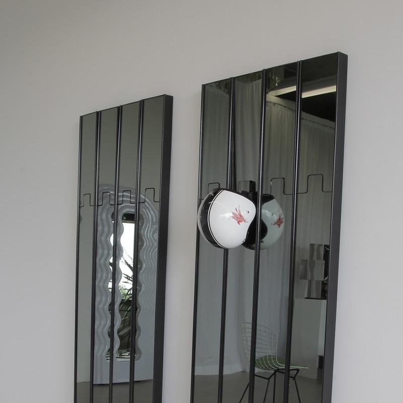 Modular mirror system (Gronda), designed by Bertoncini (winner of the RED DOT award in 1972) under the artistic direction of Joe COLOMBO. Wall mirrors, all of which have a coat rack, through using a movable recess. Brackets for hanging the mirrors in sets of four are available with the set. FANTASTIC! Mirror and wall sculpture in one.