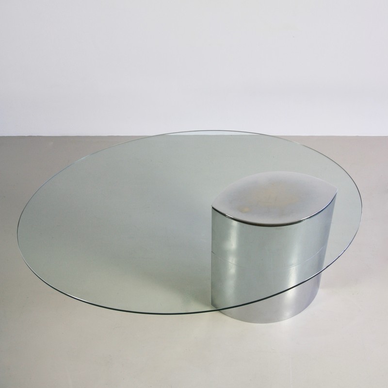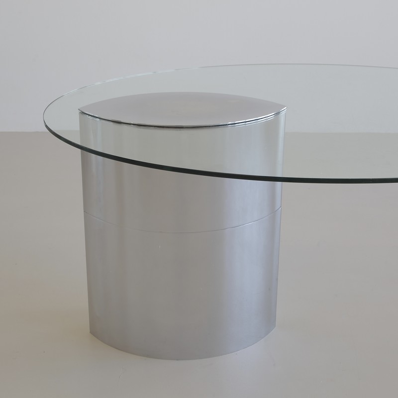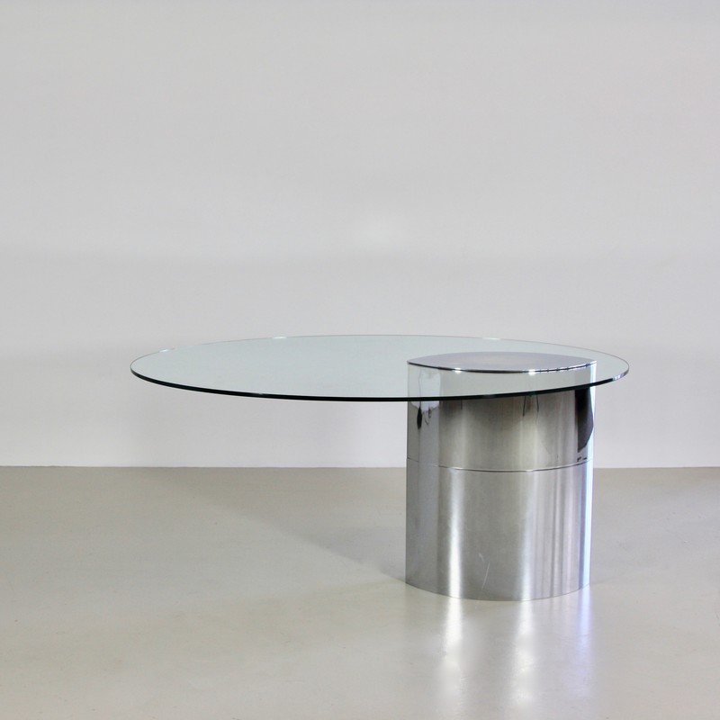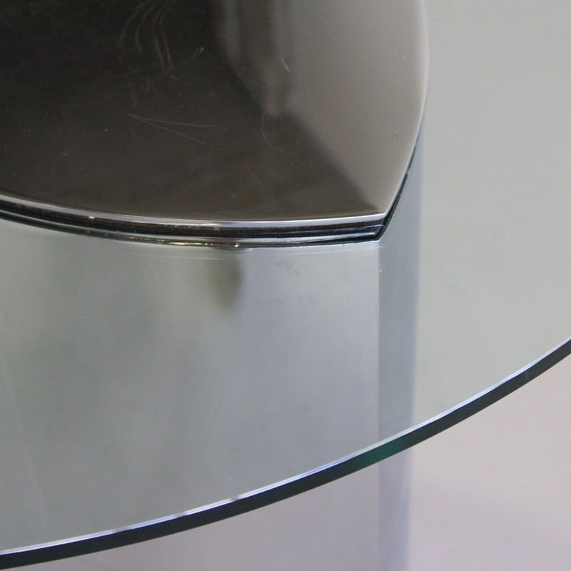 The LUNARIO table, consisting of a weighted chrome base with cantilevered glass top, both in matching elliptical shape. Superb minimalist design by Boeri. Gavina, the producing company of this table was taken over by Knoll International during production of this table.