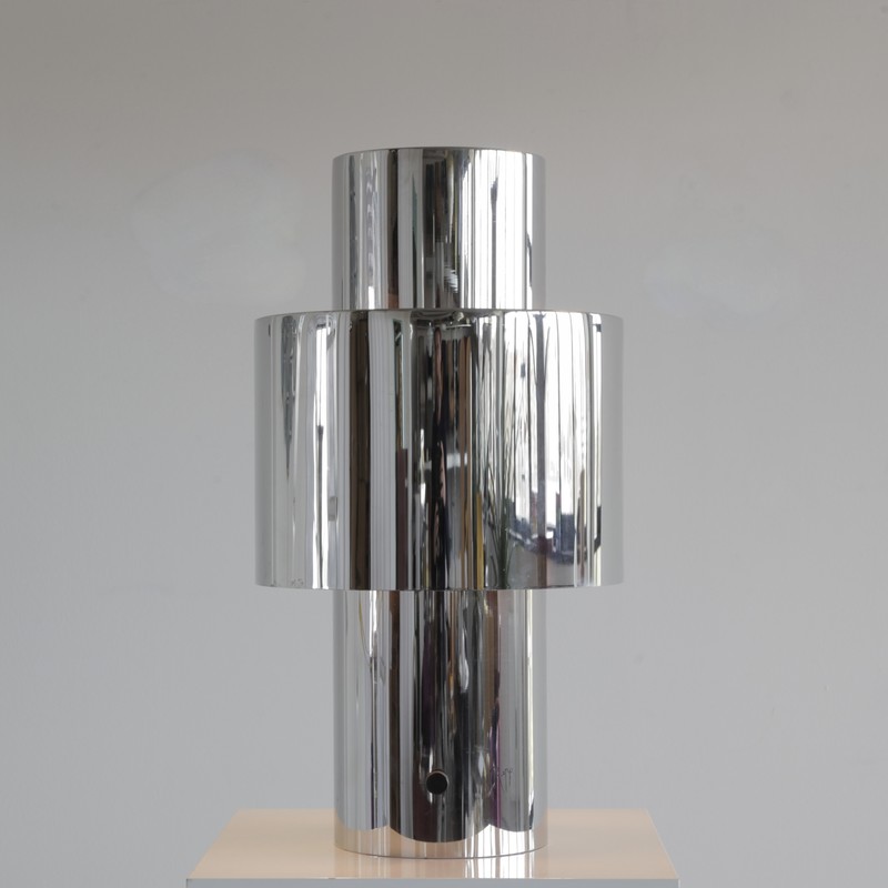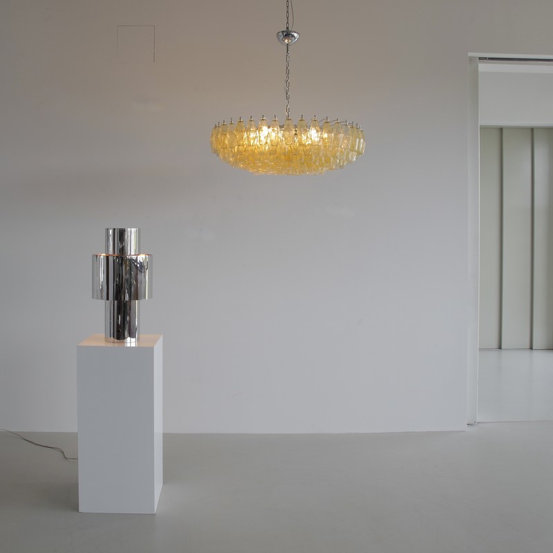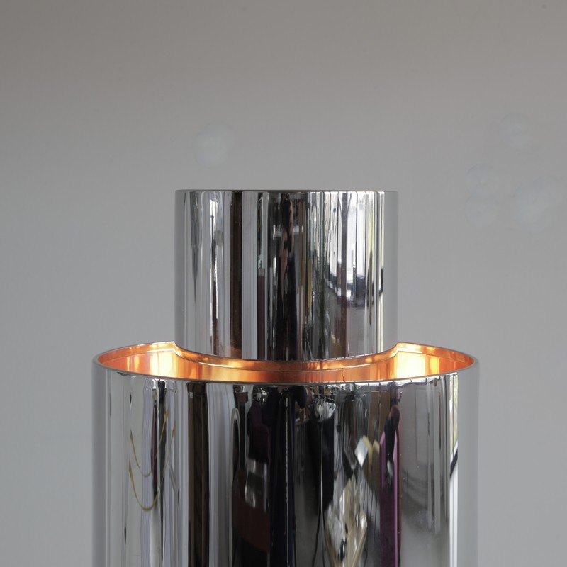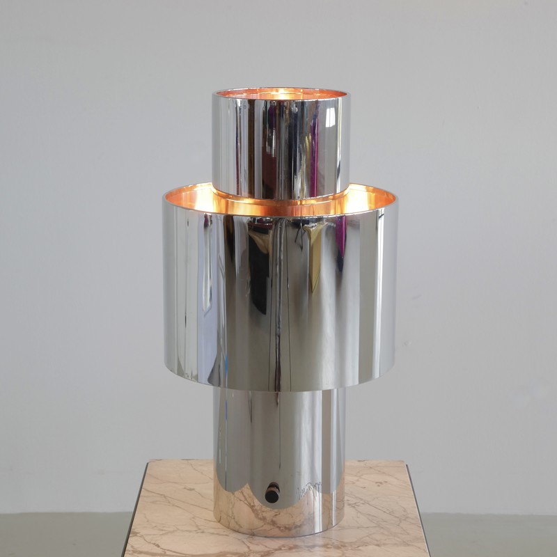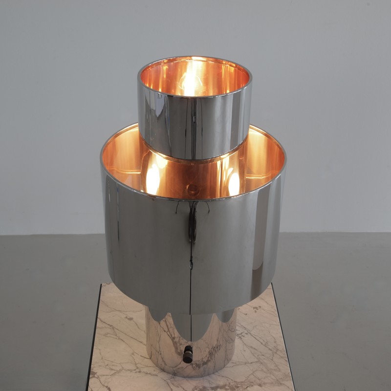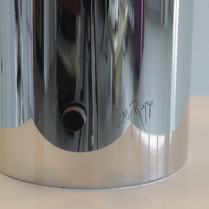 Round stainless steel lamps with copper lining, with five light sockets and dimmer. The model LAMP-RO designed in 1970, also known as lamp 'LOVE'. Signed by Willy Rizzo in black felt pen. We do have the original purchase invoice for the lamp.