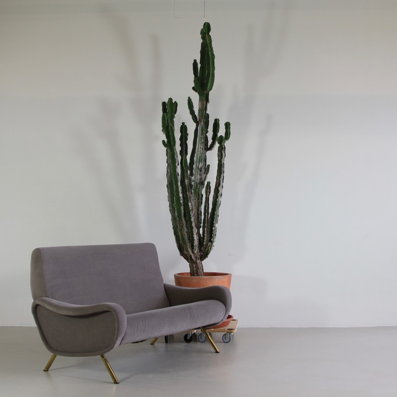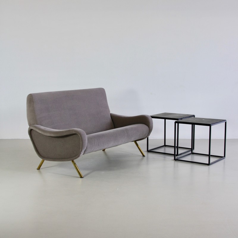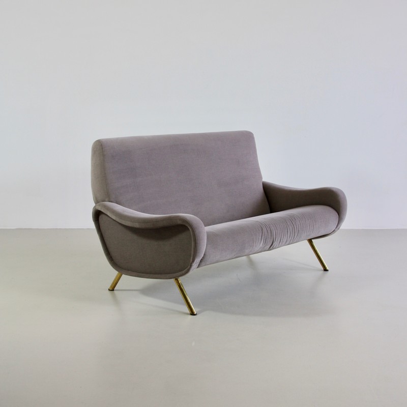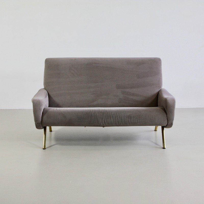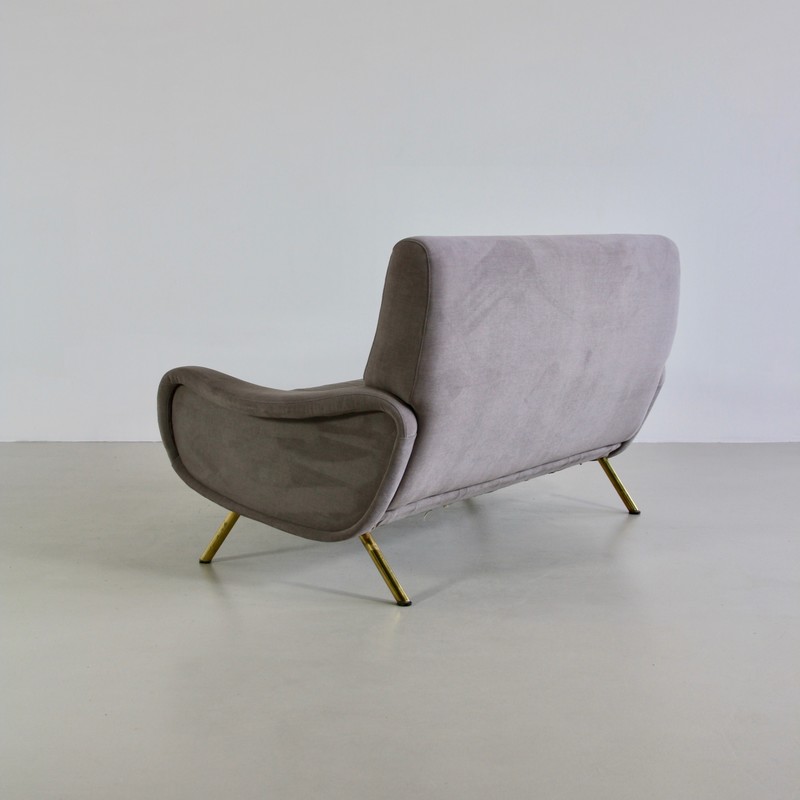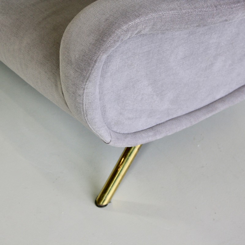 The LADY two seat sofa, metal frame with wooden construction. Recently upholstered in grey velvet material. Brass legs. Rare and comfortable!