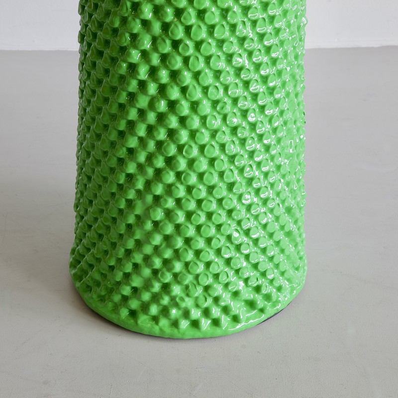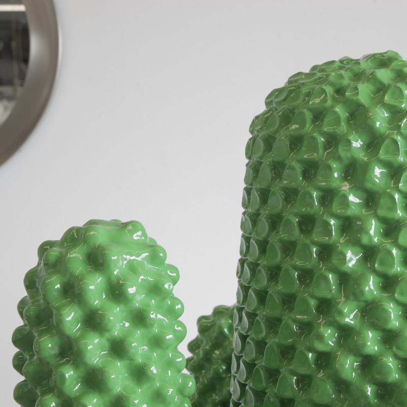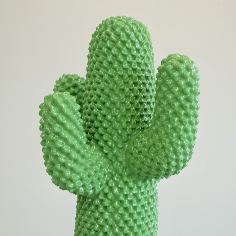 Made from flexible polyurethane foam, the Cactus is soft and without thorns. It has long been a design classic and is shown in the most renowned art and design museums throughout the world. The production is completely hand-made done by Gufram. Each of the 2,165 tips that characterize the surface of the Cactus is manually touched up by skilled workers and later given Guflac, a colour coating patented by Gufram.