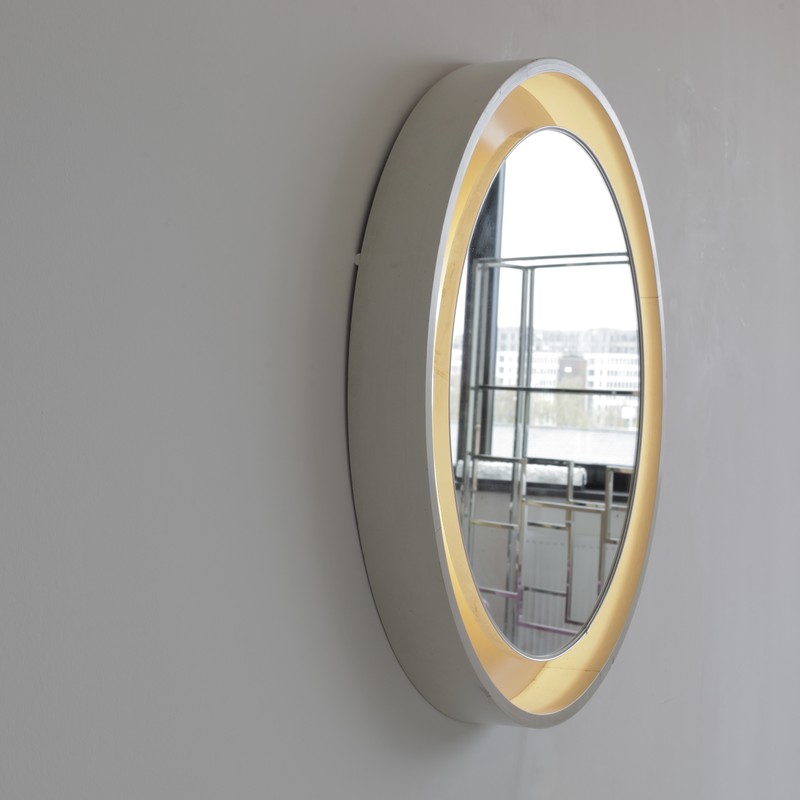 BackPrint this pageShare this page on FacebookTweet this pageScrollTop Enquire/PurchaseLarge Round Illuminated Wooden Mirror, 1970sREF. 0403Sold Nov 2025DescriptionLarge wooden-frame mirror. Italy, 1970s. A large illuminated mirror with 8 light sockets hidden behind the mirror glass. Painted and curved wood in light grey with mirror insert and back-lighting. Gorgeous! Condition: Good vintage condition, some minor marks and scratches. Diameter: 90 cm = 35.43 "Depth: 10 cm = 3.94 "