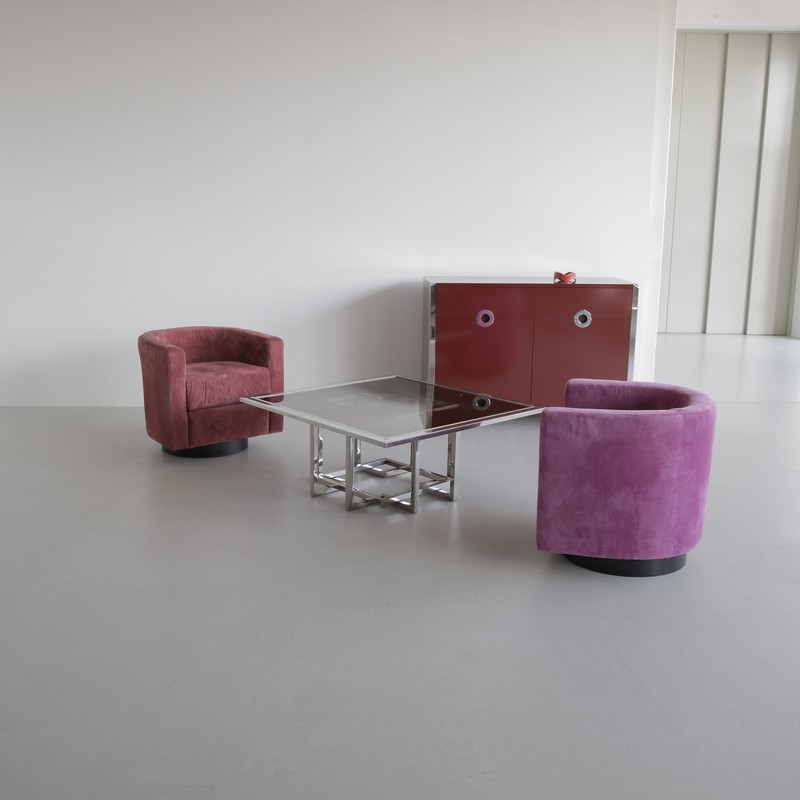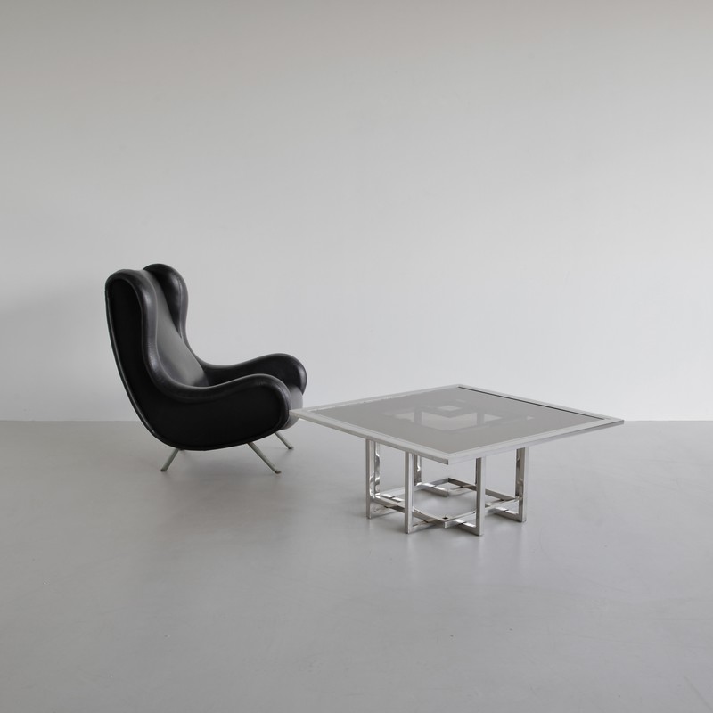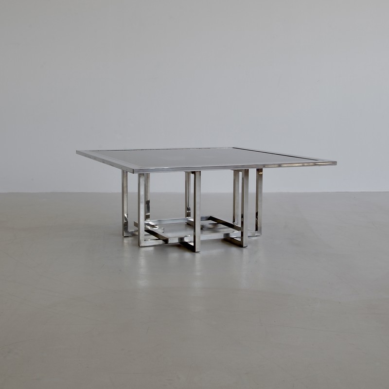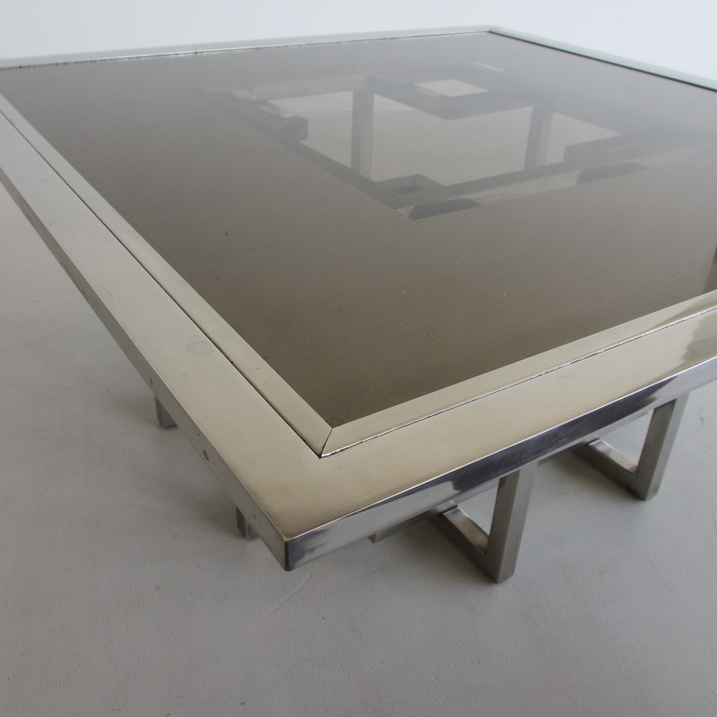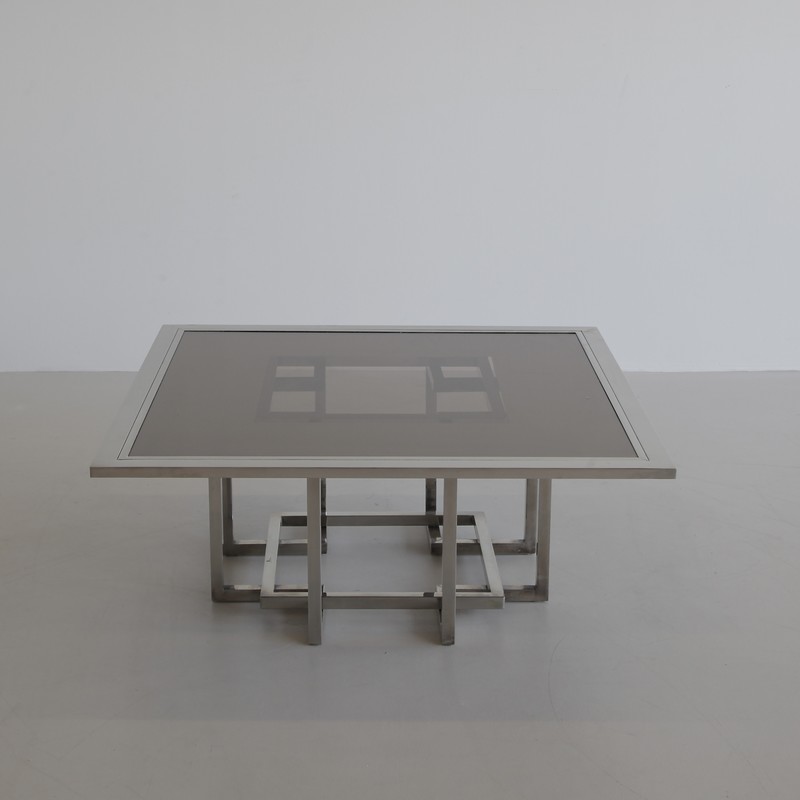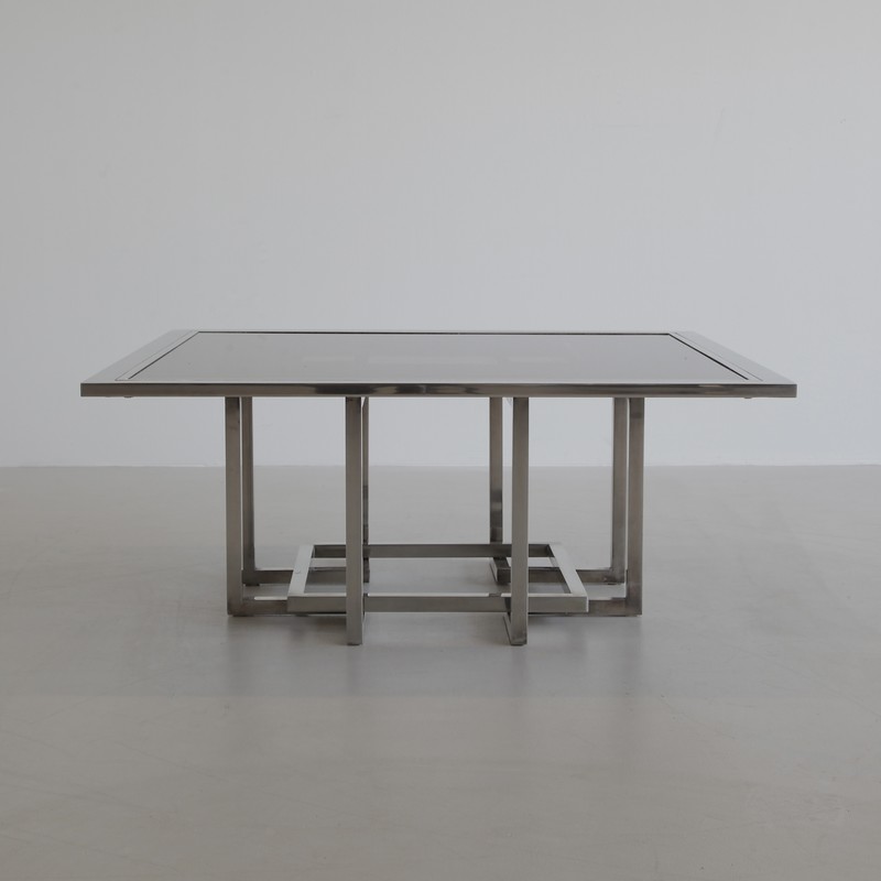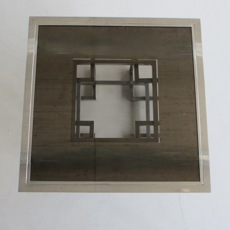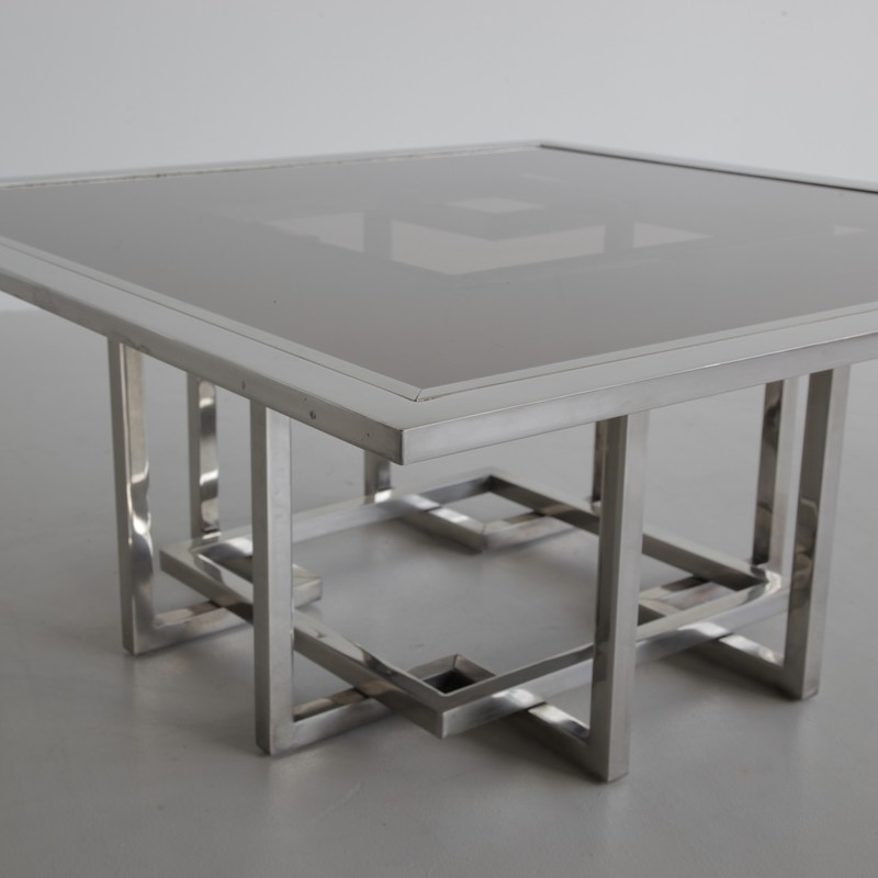 Square coffee table with nickel plated base and tinted glass top with nickel plated frame.