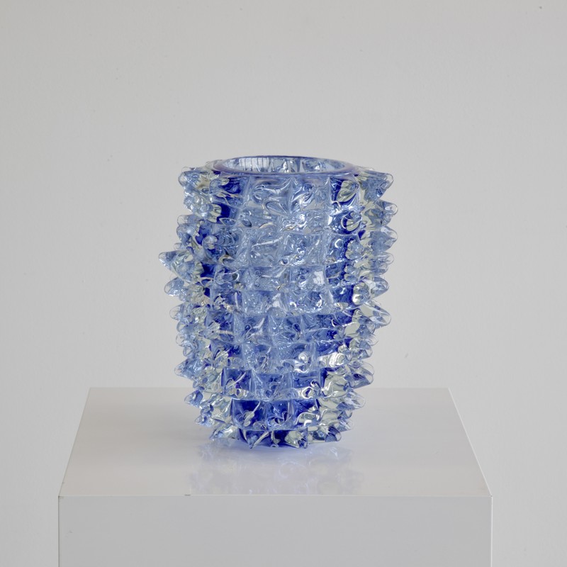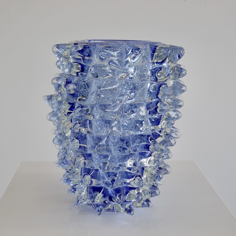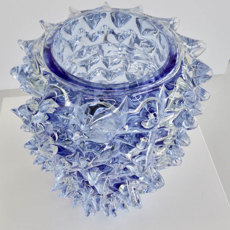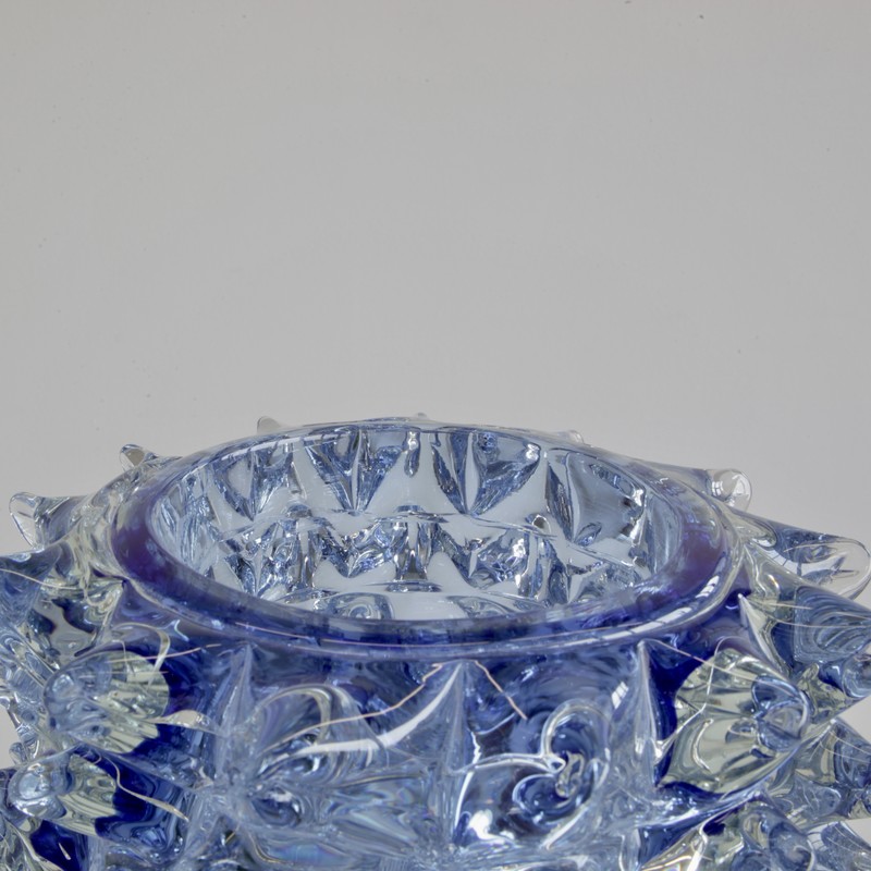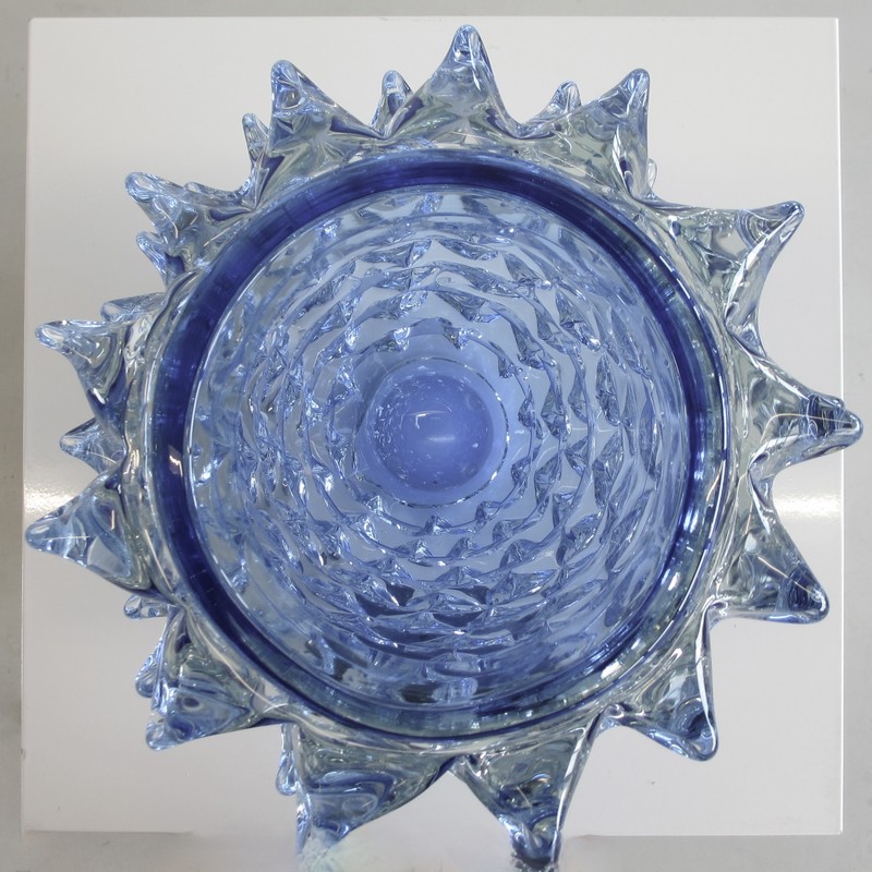 Blue 'Rostrato' glass vase with spikes, engraved with signature on base. Heavy and decorative piece, made on the Island of Murano. Signed.