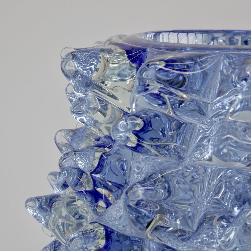 Hand-blown in one of the oldest and last remaining glass furnaces on the island of Murano in clear and sky blue pigment-infused glass.