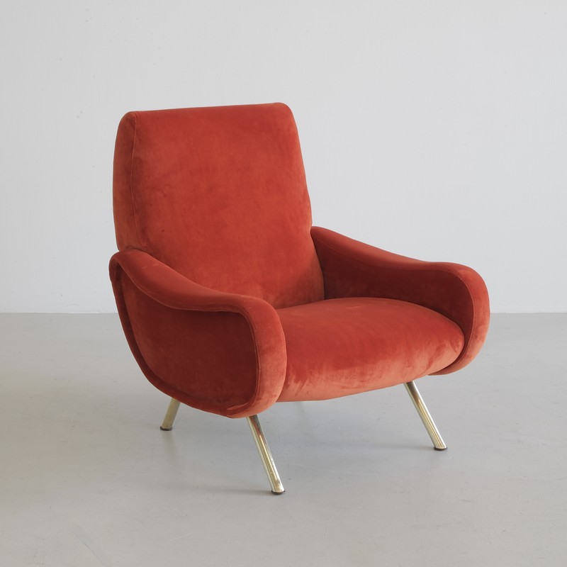 An original 'LADY' lounge chair designed by Marco Zanuso for Arflex, Milano. The chair has been upholstered in fine English burnt orange velvet material. Brass legs. Seat height 36 cm. The chair design was awarded the Gold Medal at the IX Milan Triennale, in 1951.