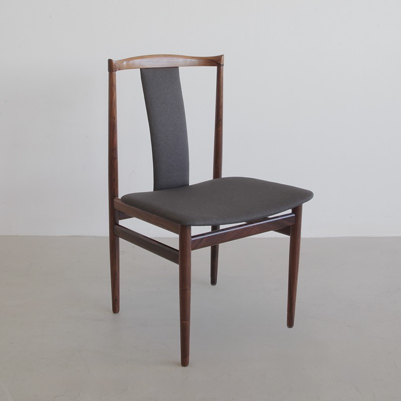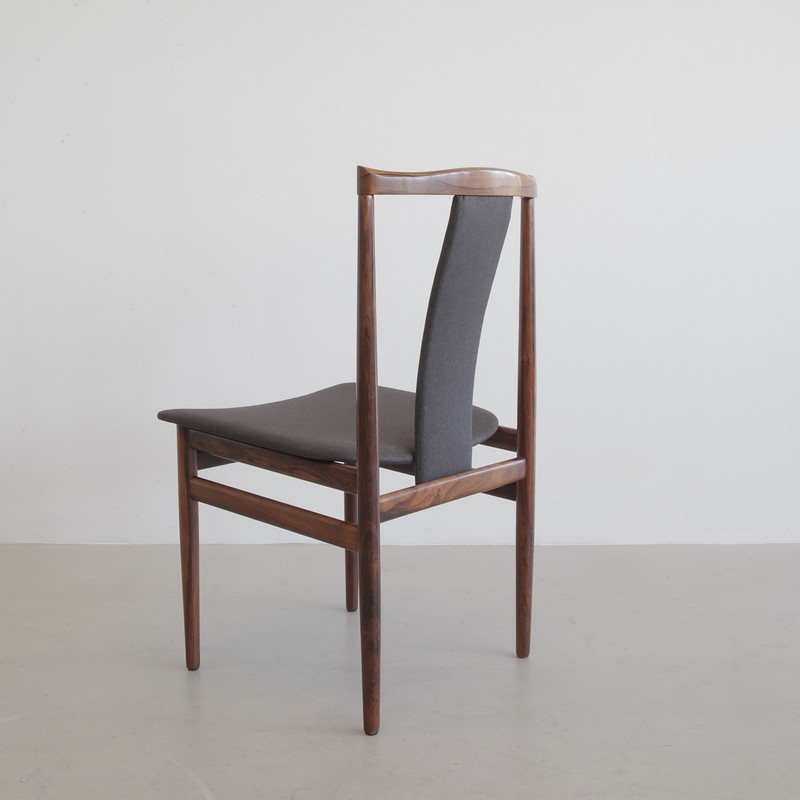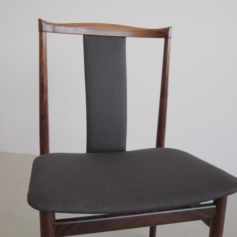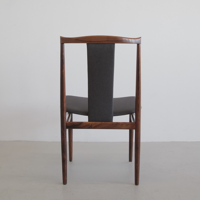 Beautiful set of Rosewood dining chairs (includes CITES Certificate) upholstered in grey wool material. Solid wood frames with sculptural backrests and unusually comfortable, wide seats. Super elegant, excellent condition, with original labels under the seat.