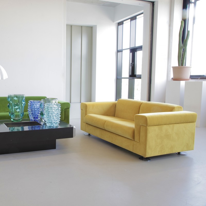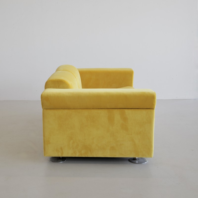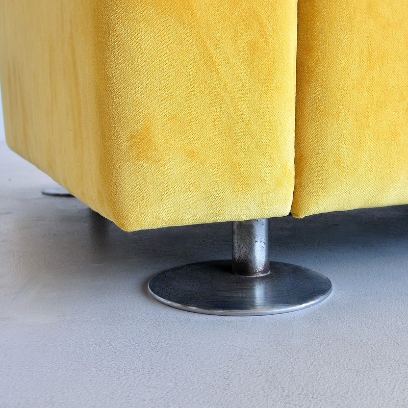 Sofa upholstered in yellow velvet designed by Tecno's Borsani and Bonetti in 1966. Polished metal feet appear retracted inwards with respect to the centre of the disk. Original Tecno label on foot. Beautiful condition!