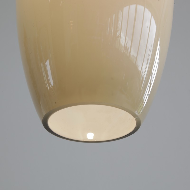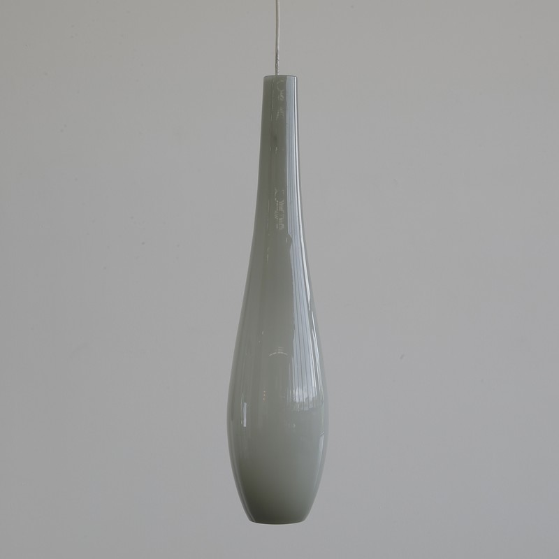 Beautifully shaped glass pendant, hand blown on Murano and produced by Vistosi. The glass is of a warm shade of grey with white lining on the inside. One light fitting has three meters of cable plus the original brass ceiling cap. Simply stunning!