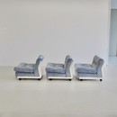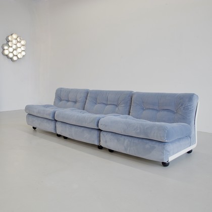 The AMANTA sofa range by Bellini, using Fiberlite (fibreglass-reinforced polyester). The flexibility was made possible by the strategically placed vertical slit in the backrest. The modular units are connected with a plastic element to form a sofa. Newly upholstered in light blue velvet. Super comfortable!