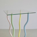 Table with white laminate base and four metal feet in different colours and square glass top. Makers metal plate with original signature in black felt pen: "ETTORE SOTTSASS".