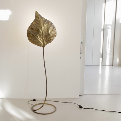 'RABARBARO' floor lamp with one large illuminated leave in hammered brass and organically shaped brass structure. Three E27 light fittings.